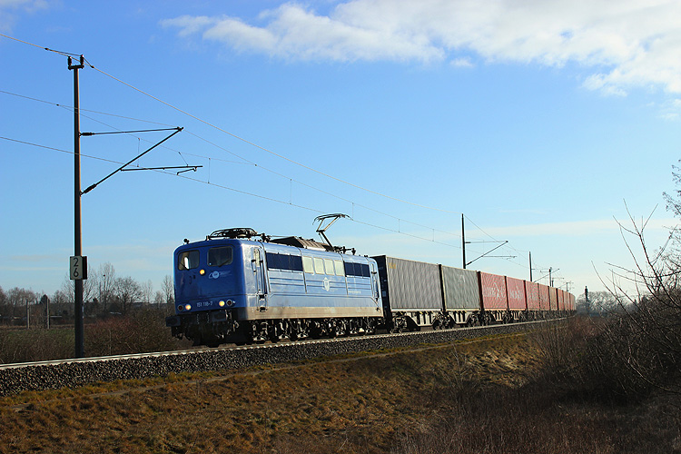 Der für die Spedition Zippel gefahrene Containerzug Berlin - Hamburg ist nun Aufgabe der EGP, am 28.02.2015 war 151 118 Zuglok. |