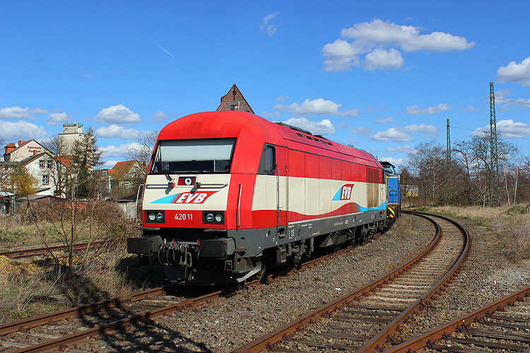 Am 05.04.2015 stand an der Alstom-Einfahrt ein EVB-Trio abgestellt, vorne war der Eurorunner 420 11. |