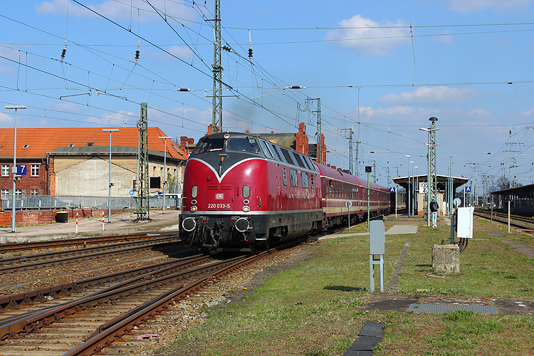 Am 19.04.2015 durchfuhr 220 033 der Hammer Eisenbahnfreunde mit einem Sonderzug von Berlin nach Hamm den Stendaler Bahnhof durch Gleis 2. |