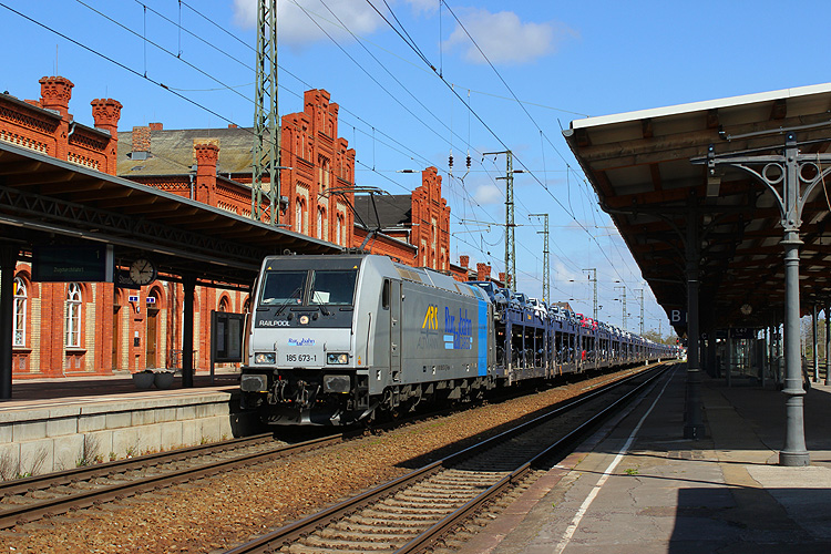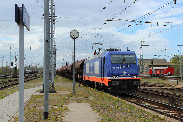 Am 22.04.2015 war mal wieder Bahnstreik. Während der Personenverkehr nahezu zum Erliegen gekommen war, rollte der private Güterverkehr ungestört weiter. Beide Raildox 185 waren an jenem Nachmittag in Stendal mit Düngerzügen zu sehen, die 419 fuhr mit dem südwärts fahrenden Leerzug aus Richtung Wittenberge kommend durch Gleis 4 in Richtung Magdeburg durch. |