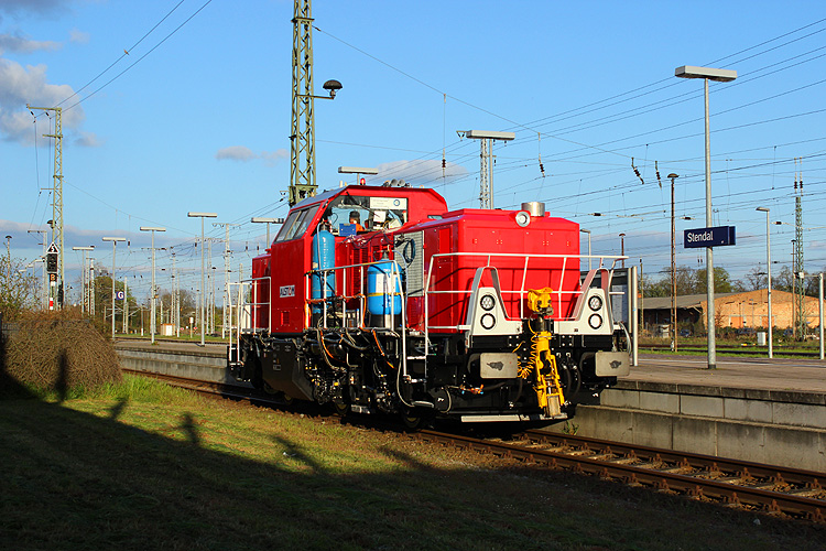 Alstom testete an jenem Tag seine neueste Schöpfung, die Hybridlok 1002 004. Sie machte mehrere Testfahrten nach Rathenow und zurück. |