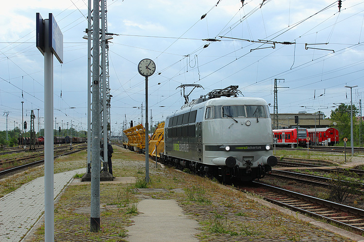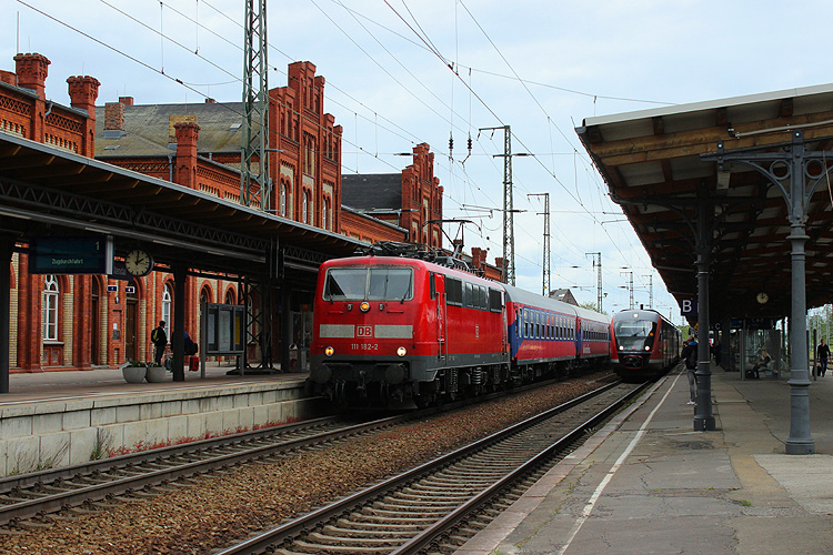 Mit einem Sonderzug von Berlin nach Hannover fuhr am 17.05.2015 111 182 durch Gleis 1 des Stendaler Bahnhofes. |