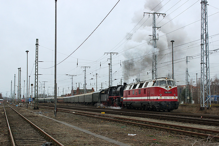Ich staunte nicht schlecht, als am 06.06.2013 bei einer Fototour in Magdeburg eine preußische T 18 auftauchte. 78 468 weilte an jenem Tag mit dem "Zug der Erinnerung", der an die Deportation der Juden in Deutschland mit der Reichsbahn erinnert, im Magdeburger Hauptbahnhof. Zwischendurch fuhr sie samt ihrer mitgebrachten Kohle- und Wasservorräte zum Restaurieren zur Hafenbahn, bei der Rückfahrt zum Hbf gelang dann im Bahnhof Neustadt dieses Bild.