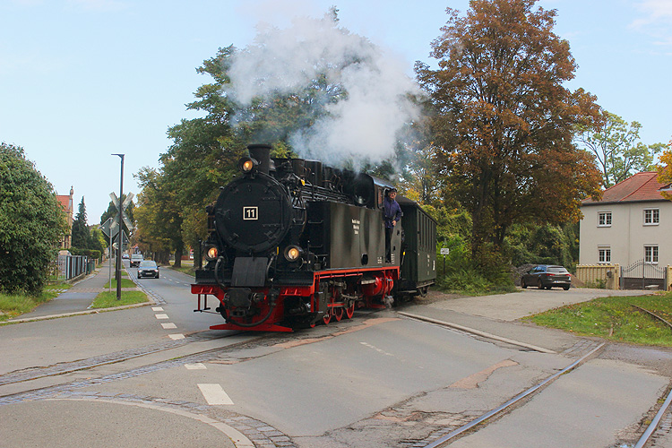 Auch eine Mitfahrt auf der Mansfelder Bergwerksbahn war im Preis inklusive, Lok 11 fährt hier aus Hettstedt Kupferkammerhütte kommend in Benndorf ein. |
