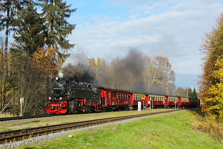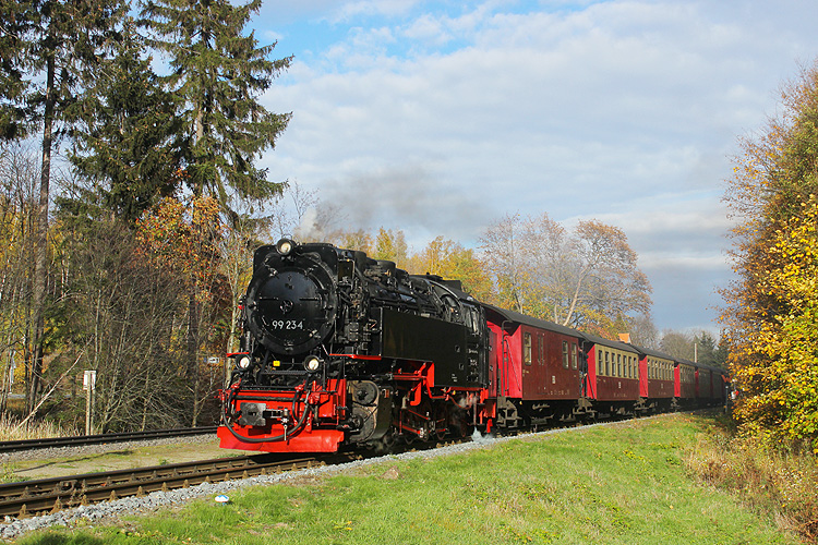 In den Herbstferien 2022 machte ich mit meinem Patenkind eine Woche Urlaub im Harz. Leider war das Wetter sehr launisch. Als am Nachmittag des 26.10.2022 mal kurz die Sonne herauskam, ging es schnell nach Drei Annen Hohne. 99 234 fuhr mit dem vom Brocken kommenden P 8929 nach Nordhausen aus. |