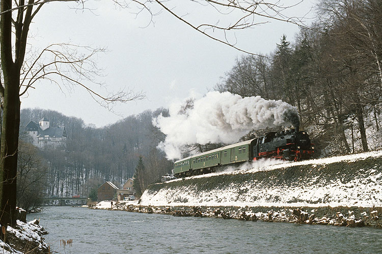 Zur Einstimmung gab es am Tag vor dem Beginn der Veranstaltung Einsätze von 86 1333 auf der Strecke Flöha - Pockau-Lengefeld - Marienberg. Hier hat die 86 mit dem P 19763 den Bf Lengefeld-Rauenstein verlassen und dampft entlang der Flöha in Richtung Pockau-Lengefeld, 22.02.1992. |