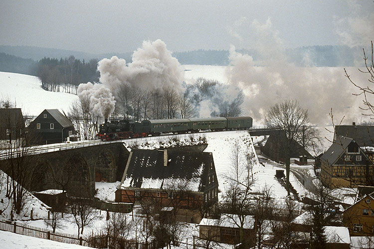 Am 23.02.1992 ging es mit dem Plandampf erst richtig los, leider zunächst bei trübem Wetter. 38 5205 war unter anderem mit dem P 18629 Aue-Chemnitz unterwegs und dampft hier durch Lößnitz. |