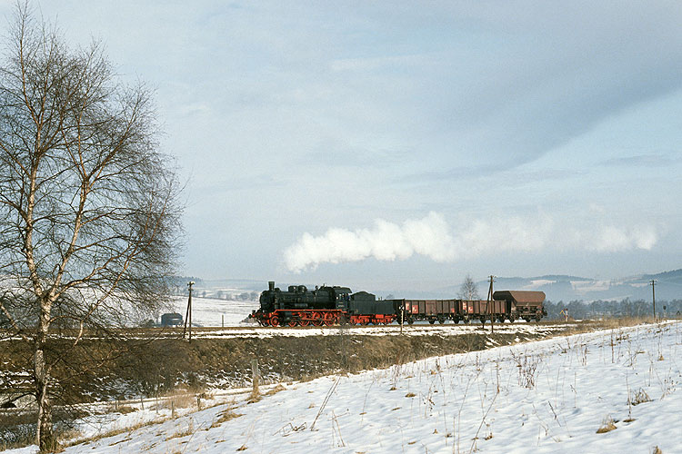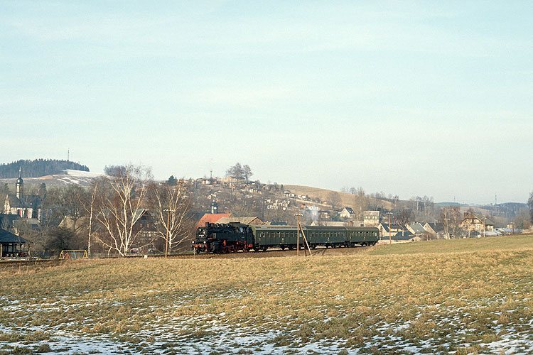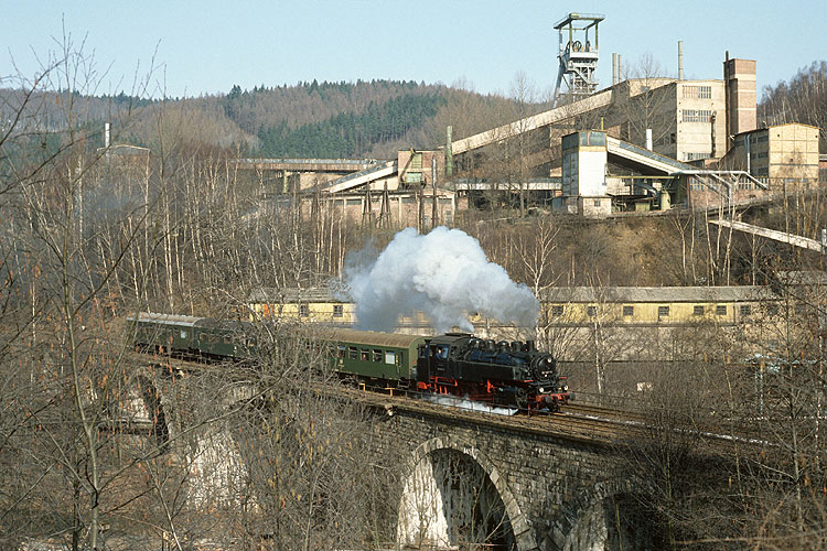 Am nächsten Tag war wieder bestes Fotowetter. So konnte ich endlich mein Dampflokfoto am Uran-Bergwerk bei Schlema machen, in den Achtzigern war ich hier von der Polizei des Feldes verwiesen worden. 86 1001 hatte den P 9633 Zwickau-Aue am Haken und passiert dieses zu DDR-Zeiten verbotene Fotomotiv, 24.02.1992. |