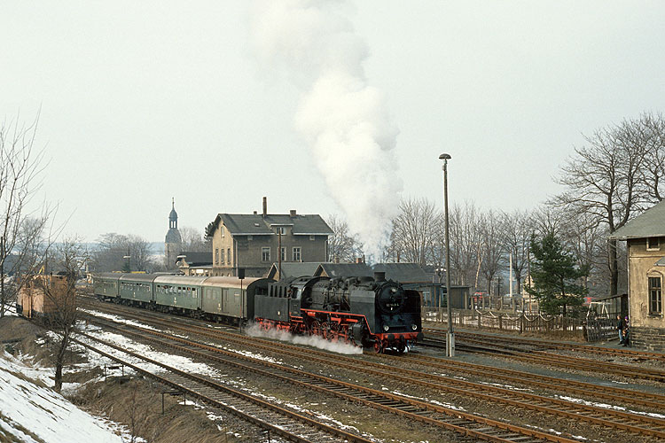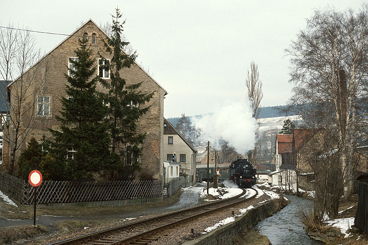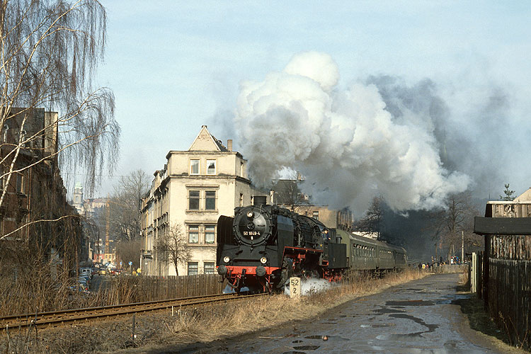 Am gleichen Tag fuhr die Altbau 50 1849 eine ehemalige Stammleistung der Auer 50 - den P 17624 nach Blauenthal, aufgenommen im Stadtgebiet von Aue. Diese Strecke führte schon zu DDR-Zeiten ein Schattendasein, nachdem sie durch den Bau der Talsperre Eibenstock unterbrochen wurde. So fuhren auf dieser einst nach Adorf weiterführenden Verbindung in den Achtzigern nur noch Montag-Freitag ein paar Personenzüge. |