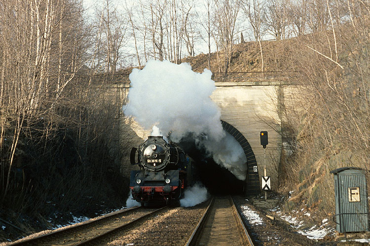 Auf der Nebenbahn Schwarzenberg-Johanngeorgenstadt war hingegen zu DDR-Zeiten so viel Verkehr, daß man diese sogar zweigleisig ausbaute. Hier war es vor allem das sowjetische Atomprogramm, das für Last im Güterverkehr sorgte. Auch im Personenverkehr war hier einst viel los, mußten doch die Kumpel zu ihren Bergwerken befördert werden. So verläßt 50 3616 mit P 9635 Zwickau-Johanngeorgenstadt auf dem 1992 immer noch zweigleisig betriebenen Abschnitt den Schwarzenberger Tunnel, 24.02.1992. |