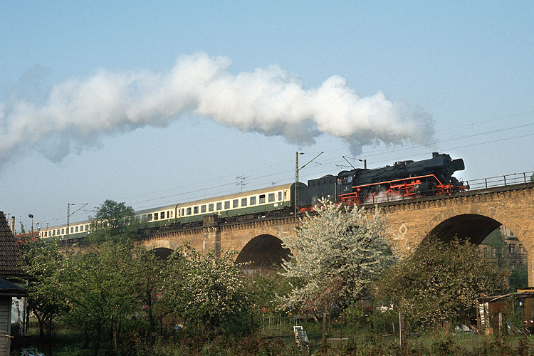 Mein erstes Bild dieses Plandampfes machte ich frühmorgens am 06.05.1992, 41 1231 war da schon mit dem D 700 Gera - Berlin unterwegs und dampft über das Viadukt in Leipzig-Wahren. |