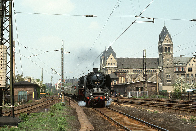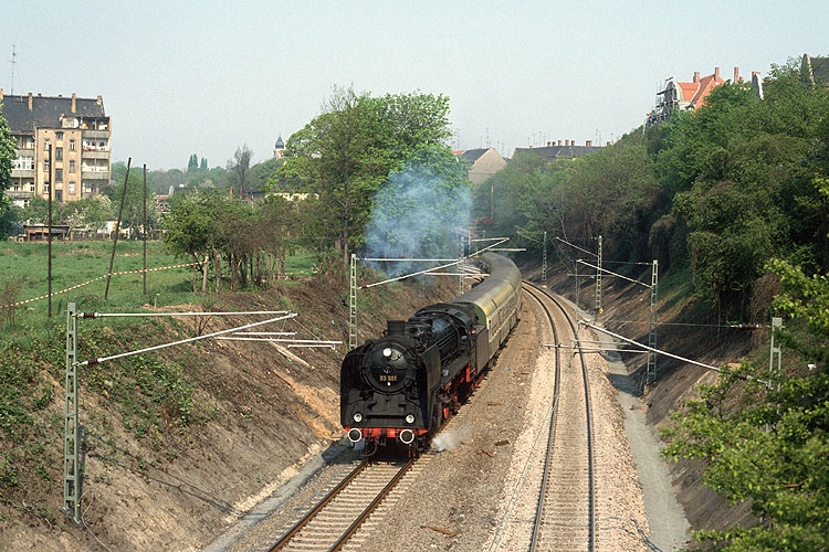 Der E 800 Saalfeld - Leipzig war an jenem Tag Aufgabe von 03 001. Der Zug hat soeben den Haltepunkt Leipzig-Coppiplatz durchfahren, nun ist es bis zum Hauptbahnhof nicht mehr weit. |