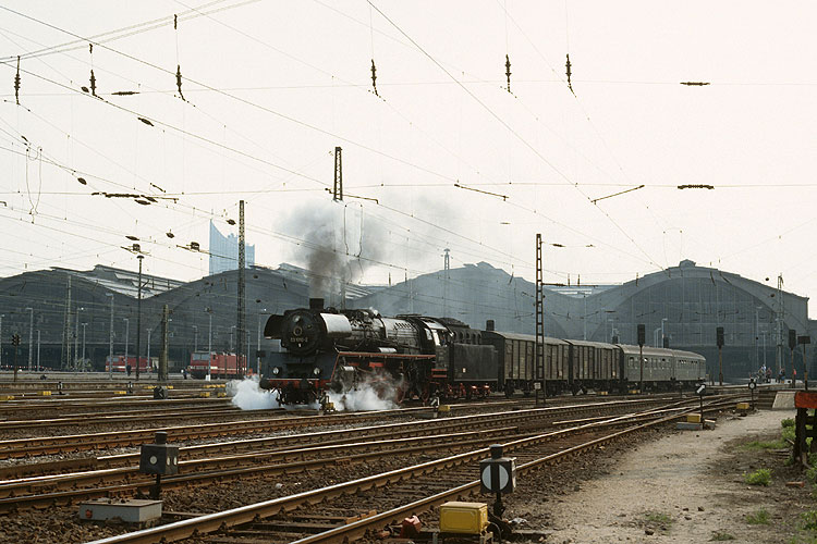 Auch 03 1010 war an jenem Tag nach Leipzig gekommen, nun verläßt sie mit dem E 805 nach Saalfeld den Leipziger Hauptbahnhof, 06.05.1992. |
