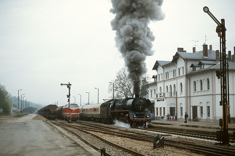 Am letzten Veranstaltungstag gab es Volldampf auf der Saalebahn. 03 1010 fuhr unter anderem den bekannten P 3003 Halle-Saalfeld und verläßt mit diesem den Bahnhof Orlamünde, 09.05.1992. |