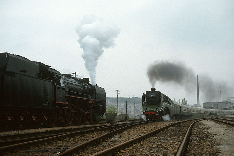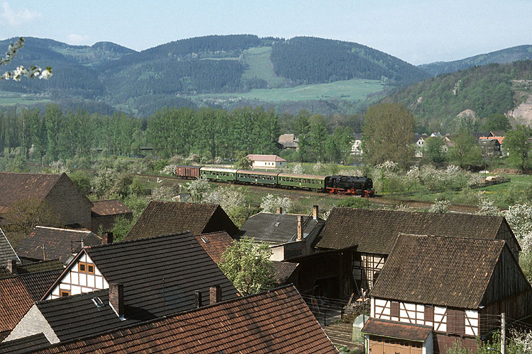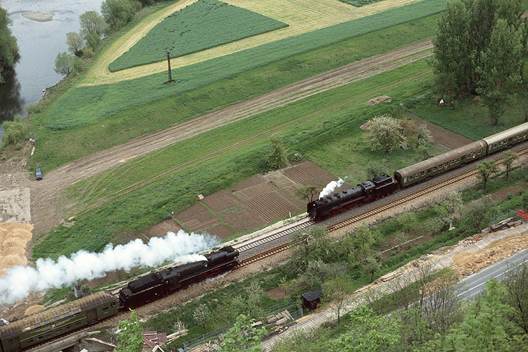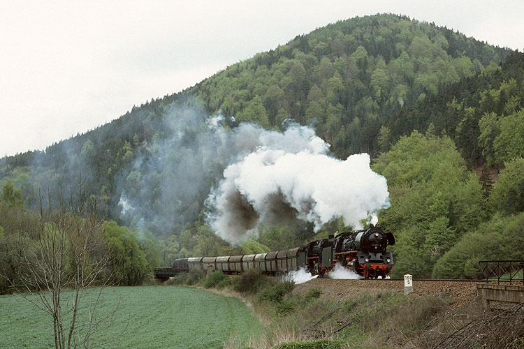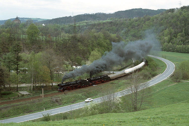 Krönender Abschluß dieses Plandampfes sollte für mich die Begegnung von P 4009 Leipzig-Saalfeld mit P 3008 Saalfeld-Halle unterhalb der Dornburger Schlösser werden. Da sowohl 03 1010 von links mit dem 4009 als auch 03 001 von rechts mit dem 3008 pünktlich auf die Minute unterwegs waren, gelang mir dieses Bild der beiden sich begegnenden Züge, 09.05.1992. Auf der nächsten Seite geht es mit dem großen Plandampf rund um Halberstadt im Frühjahr 1992 weiter. |