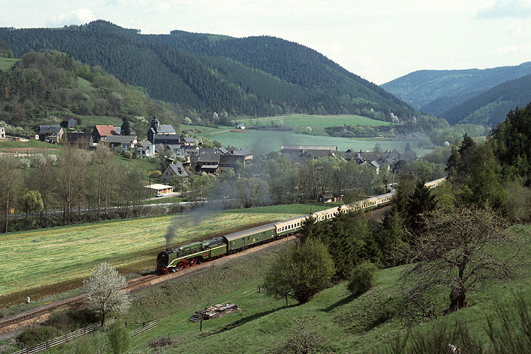 Wie am Vortag hatte 18 201 wieder den D 1403 nach Nürnberg am Haken, den sie bis Probstzella zu bringen hatte. Auf dem damals noch eingleisigem Abschnitt Saalfeld-Probstzella ist der Zug hier bei Unterloquitz zu sehen. |