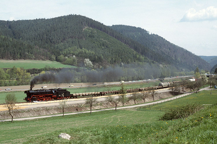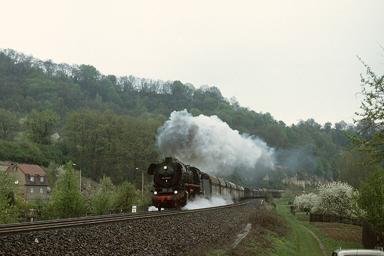 Dem Schnellzug folgte der Dg 55477 Saalfeld-Probstzella mit 44 1093, ebenfalls bei Unterloquitz fotografiert. An dieser Stelle hatten die Bauarbeiten für das zweite Gleis bereits begonnen. |