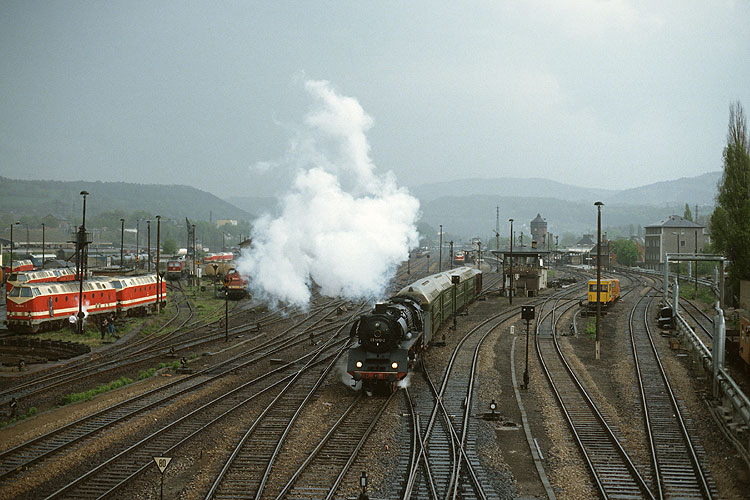 Am zweiten Veranstaltungstag herrschte leider trübes Wetter. Morgens war 03 1010 mit dem E 800 wieder nach Leipzig unterwegs, sie fährt mit dem Zug aus Pößneck oberer Bahnhof aus, 07.05.1992. |