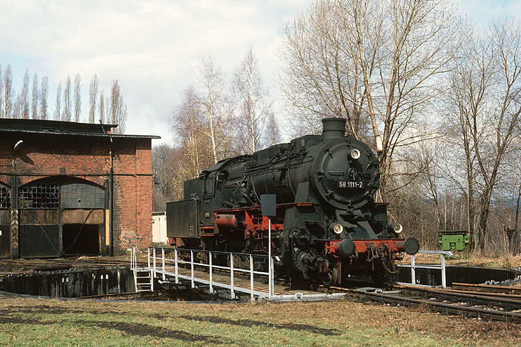 Auch hier konnte sich 58 1111 heimisch fühlen, in der ehemaligen Einsatzstelle Schwarzenberg des Bw Aue. Am 06.04.1993 war der Lokschuppen noch in einem ruinösen Zustand, heute ist er Domizil der Schwarzenberger Eisenbahnfreunde. |