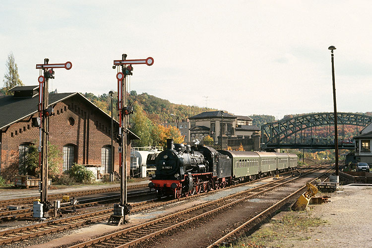 Bei einem Plandampf im Elstertal konnte ich unter anderem 38 1182 beim Einrollen in den Bahnhof Greiz mit dem N 8314 Weischlitz-Gera aufnehmen, 10.10.1993. |