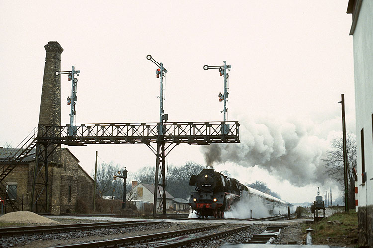 Beim "Metropol"-Plandampf im Frühjahr 1994 gab es neben Schnellzügen Magdeburg-Berlin und Berlin-Frankfurt(O) auch Eilzugeinsätze auf der Ostbahn nach Küstrin. An der Signalbrücke des Bahnhofes Müncheberg vorbei fährt hier 03 2204 mit dem E 305 Berlin-Gorzow aus, 01.04.1994. |
