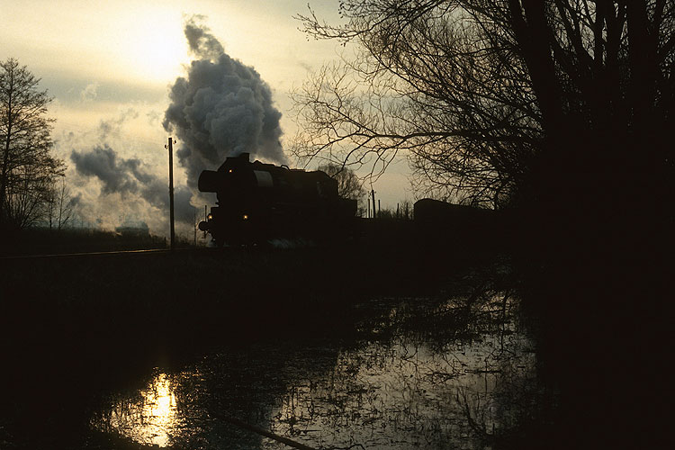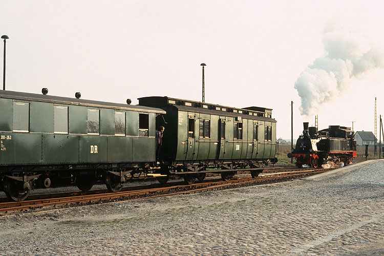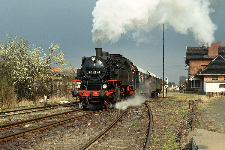 Einen letzten großen Altmark-Plandampf gab es im Frühjahr 1994. Dieses Mal war das Bw Salzwedel Ausgangspunkt der Veranstaltung. Gefahren wurde nicht nur auf den einst staatlichen Haupt- und Nebenbahnen nach Oebisfelde, Stendal und Wittenberge, sondern auch auf den Gleisen der einst privaten Kleinbahnen nach Dähre und Kalbe/Milde. Für die Kleinbahnzüge war 91 134 mit den alten zwei- und dreiachsigen Personenwagen eine durchaus stilvolle Garnitur. Hier setzt sie nach der Ankunft mit dem N 6856 aus Salzwedel im Bahnhof Dähre um, 07.04.1994. |