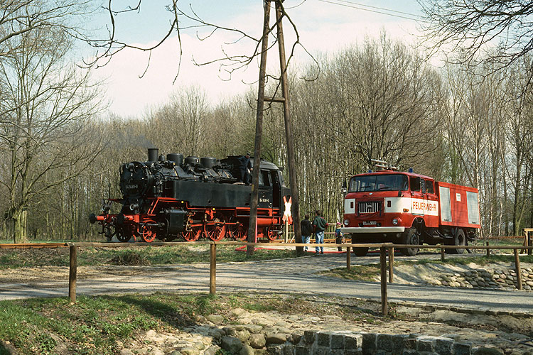 Auch 64 1491 paßte gut auf die Kleinbahnstrecken, beendete doch die Baureihe 64 einst im Jahre 1974 den Dampfbetrieb hier. Die Altmark-64 waren mit Pulsometeranlagen ausgerüstet und konnten so aus Brunnen und Flüssen ihre Wasserkästen füllen. Solch eine Anlage hatte 64 1491 natürlich nicht, so das die Feuerwehr beim Wassernehmen aus der Milde bei Kalbe Hilfe leisten mußte, 08.04.1994. |