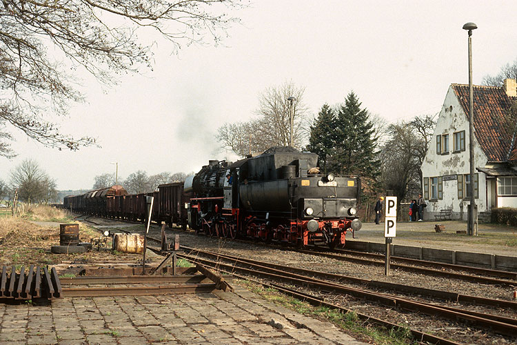 Auch bei der Rückfahrt von 52 8154 machte ich ein Foto, sie ist als Üg 68104 wieder in den Kleinbahnteil des Bahnhofes Hohenwulsch eingefahren, 09.04.1994. |