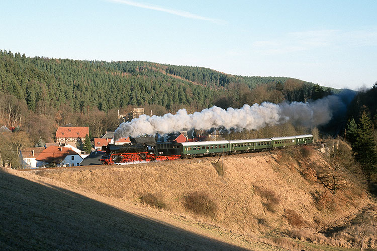 Erst im Februar 2001 ließ ich mich mal wieder bei einem Plandampf blicken, beim "Goldene Aue #3" in Thüringen. An den Veranstaltungstagen herrschte leider trübes Wetter, aber die Zuführung der Glauchauer 35 1097 am 16.02.2001 lief bei bestem Wetter ab. So konnte ich unter anderem diese Aufnahme in Pößneck machen. |