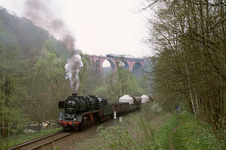 Nun wieder auf den Geschmack gekommen war ich auch beim Vogtland-Plandampf im Frühjahr 2001 dabei. Einer der Höhepunkte der Veranstaltung war diese Szene - 50 3616 wartete mit ihrem Fotogüterzug auf der Elstertalbahn Gera-Weischlitz bei Jocketa die das Tal überquerende 52 8154 mit dem RE 17245 Reichenbach-Adorf ab, 04.05.2001. |