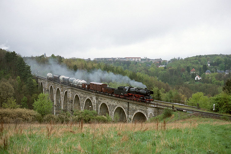 Auch am letzten Veranstaltungstag hatte das Wetter kein Einsehen. Am Syrautalviadukt in Plauen rollt 50 1380 mit einem Fotogüterzug von Plauen nach Bad Brambach talwärts, 06.05.2001.