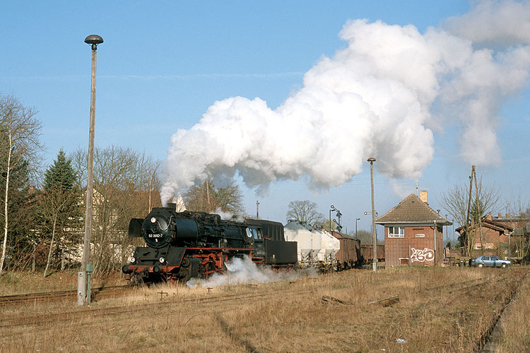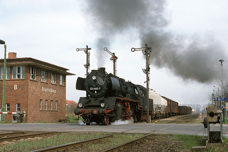 Kurz vor Toresschluß für die Strecke Salzwedel-Oebisfelde fuhr 50 3682 hier noch einmal an zwei Tagen ein Foto-Güterzugpaar von Salzwedel nach Magdeburg und zurück, aufgenommen bei der Ausfahrt aus dem Bahnhof Beetzendorf in Richtung Klötze am 30.03.2002.