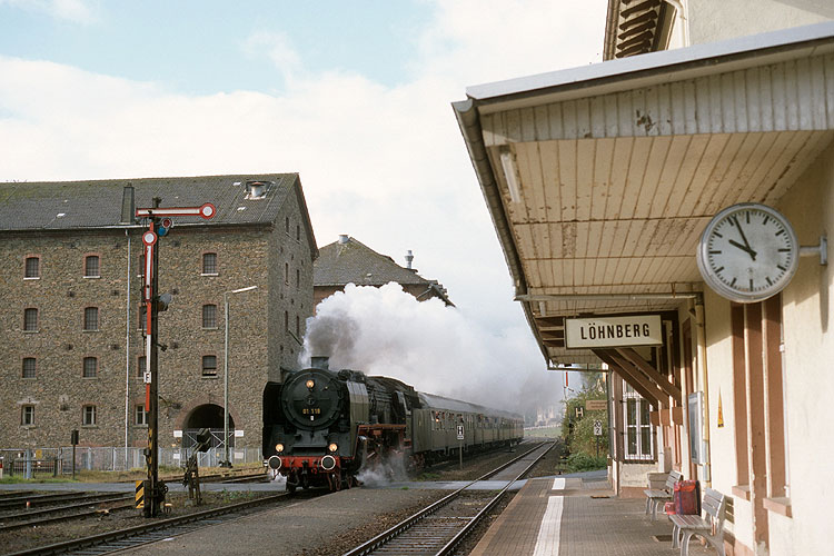 Die Plandampf-Idee wurde inzwischen auch im Westen umgesetzt, 01 118 der historischen Eisenbahn Frankfurt (M) durchfährt auf der Lahntalbahn mit einem RE von Koblenz nach Gießen den Bahnhof Löhnberg, 06.10.2002. |
