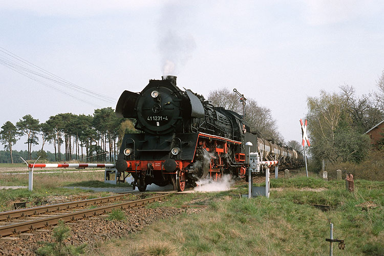 Für die meist kleineren Veranstaltungen im neuen Jahrtausend wurden mangels planmäßiger Güterzüge oft Güterzüge speziell für Fotozwecke eingelegt. So kommt man auch bei nur einer Lok auf seine Kosten, da viele Halte durchgeführt werden können. Am 17.04.2004 war die Staßfurter 41 1231 mit solch einem Fotogüterzug von Staßfurt nach Oebisfelde unterwegs und fährt nach einem geplanten Halt vor dem Einfahrsignal des Bahnhofes Wegenstedt wieder an.