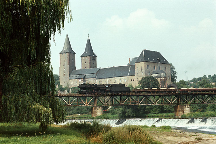 50 3657 hat sich mit dem Gag 56353 auf den Weg nach Glauchau gemacht und überquert vor der Kulisse des Rochlitzer Schlosses die Mulde, 05.08.1982. |
