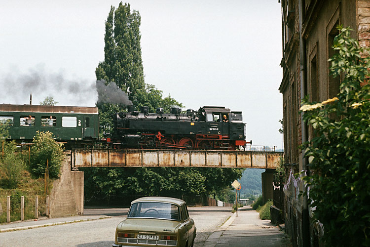 Zum Stadtjubiläum von Limbach-Oberfrohna durfte auch mal 86 1501 ran, hier rollt sie mit einem Sonderzug von Oberfrohna nach Wittgensdorf oberer Bahnhof durch Limbach, 25.06.1983. |