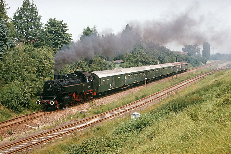 Kurze Zeit später ist 86 1501 bei Hartmannsdorf schon wieder in Gegenrichtung mit einem Sonderzug nach Oberfrohna unterwegs, 25.06.1983. |