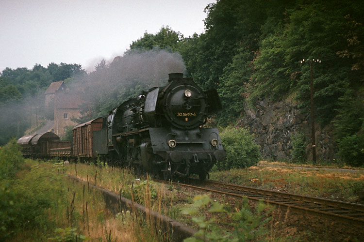 Auch Personenzüge wurden in den Achtzigern planmäßig von den Glauchauer 50 gefahren, wie hier der P 19736 Glauchau - Penig. Der von 50 3697 gezogene Zug dampft gerade an Thierbach vorbei, 17.07.1982. |
