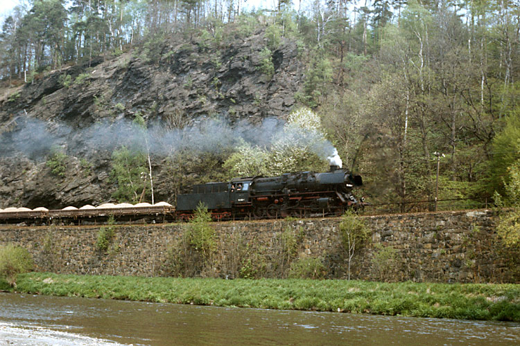 Die Salzwedeler 50 3576 verschlug es erst 1984 zum Bw Glauchau, nun dampft sie mit dem Gag 56353 entlang des Hauboldfelsens bei Wolkenburg muldeaufwärts, 11.05.1985. |
