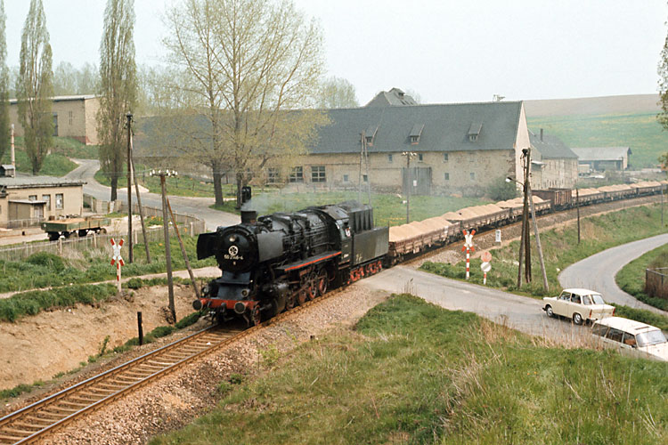 Dank dem schnellen Motorrad meines Freundes gelang uns kurze Zeit später noch diese Aufnahme des Gag 56355 mit 50 2146 bei Penig, 12.05.1985. |