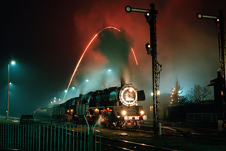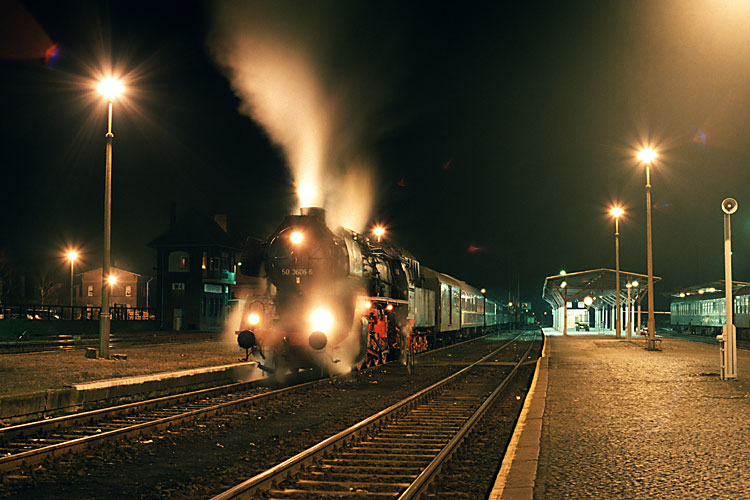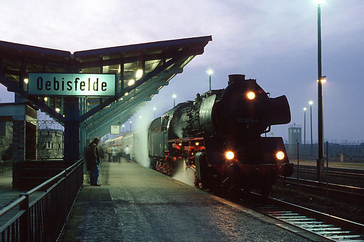 Die erste Silvesterfahrt führten die Oebisfelder Eisenbahnfreunde zum Jahreswechsel 1990/91 durch. Mit 50 3606 und der Staßfurter 50 3695 ging es von Oebisfelde über Stendal und Salzwedel nach Oebisfelde zurück. Hier heizt 50 3606 den Zug schon mal vor, bevor er mit einer 218 erstmal nach Wolfsburg pendelte, wo die meisten Fahrgäste abzuholen waren. Der Zug steht am Bahnsteig 1 West, dem ehemaligen Bahnsteig des Grenzüberganges, hier wurden einst die Züge und Reisenden bei der Ein- und Ausreise kontrolliert. |