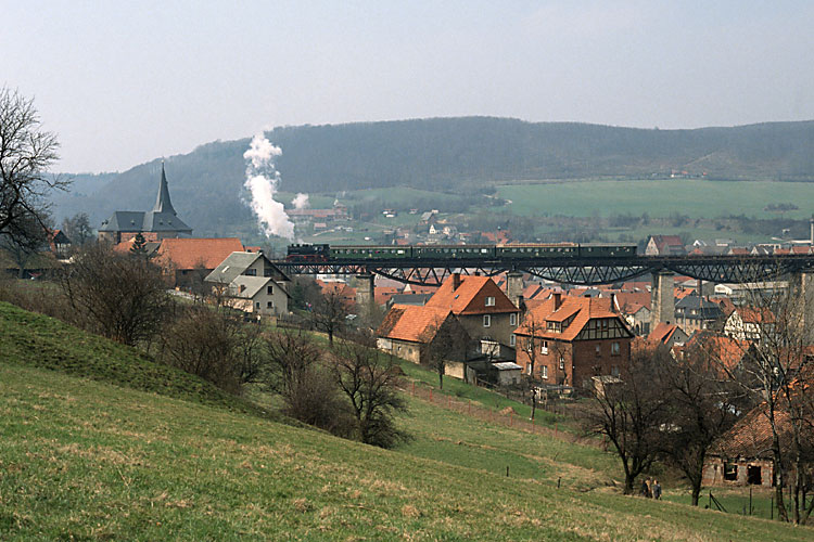 Mit der Eisenacher 91 6580 wurde zu Ostern 1991 eine Fahrt von Gotha über Leinefelde nach Geismar und zurück organisiert. So kam endlich auch mal wieder ein Dampfzug auf das schon zu DDR-Zeiten bedeutungslos gewordene Teilstück der Kanonenbahn Leinefelde-Geismar-(Eschwege) mit seinen Tunneln und Viadukten. Diese Tour ließ ich mir nicht entgehen, hier verläßt der Zug auf der Hinfahrt einen der Tunnel bei Großbartloff, 30.03.1991. |