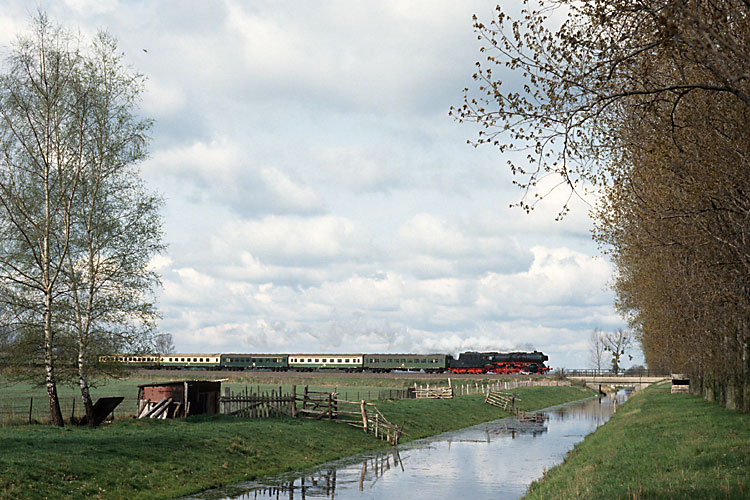 Am 20.04.1991 gab es dann wieder eine Sonderfahrt in der heimatlichen Altmark, mit 50 3606 und 50 3649 ging es von Oebisfelde nach Klötze und zurück. Zwischen Oebisfelde und Kunrau durchquerte die Strecke das Feuchtgebiet Drömling, heute Naturpark. Hier nimmt der Zug am Allerkanal bei Buchhorst Anlauf zur Überquerung des Mittellandkanals. |