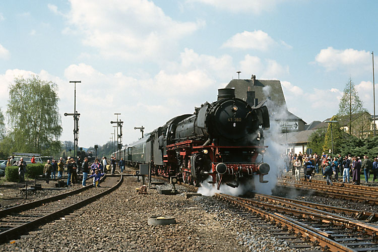 Als Dank für die Hilfe bei ihrer Altmarksonderfahrt im Herbst 1990 luden uns die Kölner Eisenbahnfreunde zur Mitfahrt in ihrem Frühlings-Sonderzug ein. Fahrtstrecke war Köln-Au-Limburg-Oberlahnstein-Neuwied-Köln, als Zuglok war 41 360 mit Zusatztender im Einsatz. Die Fotohalte waren wegen der vielen Fahrtteilnehmer etwas kompliziert, wie hier in Altenkirchen zu erahnen ist, 21.04.1991. |