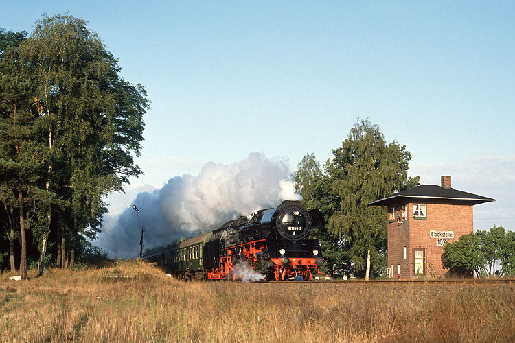 Zum Tag der Deutschen Einheit ging es dann mit der Staßfurter 41 1185 von Oebisfelde nach Berlin und zurück, aufgenommen an der Blockstelle 107 bei Kloster Neuendorf, 03.10.1991. |