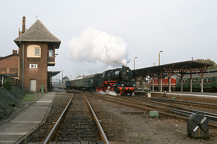 Für die Herbstfahrt am 03.10.1992 ins Eisenbahn-Museum Schwerin nutzten wir wieder unsere Vereinslok 50 3606, die gerade ihren Zug in Oebisfelde an den Bahnsteig rangiert. |