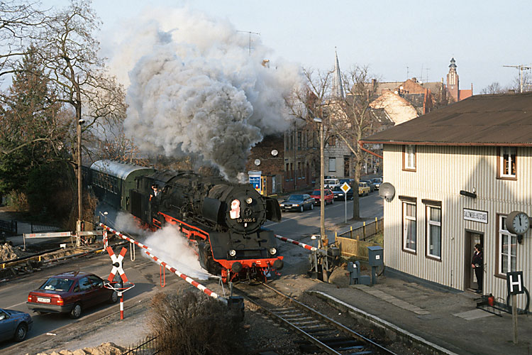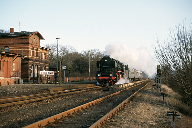 Auch 1992 fuhren die Oebisfelder Eisenbahn-Freunde wieder Nikolaus-Züge, am 06.12.1992 ging es dabei wie gehabt von Oebisfelde nach Beetzendorf und zurück. Um die Rückfahrt nicht wieder Tender voran antreten zu müssen, fuhr der Zug leer nach Salzwedel weiter, wo die Lok gedreht werden konnte. Auf der Rückfahrt nach Beetzendorf passiert hier 50 3606 mit dem Leerzug den Haltepunkt Salzwedel-Altstadt. |
