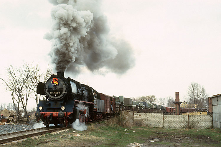 Am darauffolgenden Tag wurden aufgrund der großen Nachfrage noch zwei Zugpaare in der Relation Stendal-Kalbe und zurück gefahren. So war 50 3606 am Nachmittag des 13.12.1992 letztmals auf dem Weg nach Kalbe und durchfährt den Bahnhof Steinfeld. |