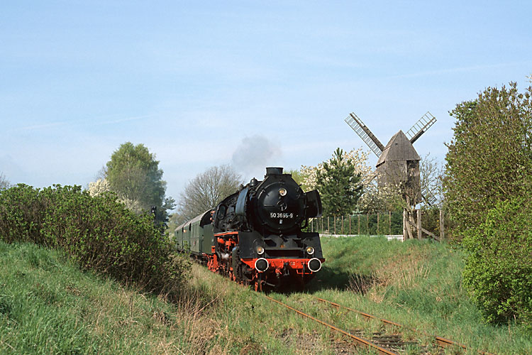 Nach dem Aus für die Oebisfelder Eisenbahn-Freunde wird die Reichsbahn-Tradition in der Altmark nun vom Mitte der neunziger Jahre entstandenen Verein "Lokschuppen Salzwedel" fortgeführt. Dort steht vor allem der Erhalt des alten Bahnbetriebswerkes Salzwedel im Vordergrund, wo mehrmals im Jahr Lokschuppenfeste gefeiert werden. Streckenfahrten gibt es leider nur selten und wenn dann wird meist von Salzwedel nach Arendsee und zurück gefahren. Hier rollt Gastlok 50 3695 aus Staßfurt an der nun restaurierten Arendseer Windmühle vorbei dem Bahnhof des Ortes entgegen, 25.04.2004. |