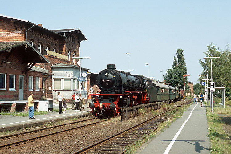 042 096 der "Dampflok-Gemeinschaft 41 096 e.V." war am 31.07.2004 mit einem Sonderzug auf der Mühlenbahn von Braunschweig nach Wittingen und zurück im Einsatz und rollt auf der Rückfahrt in den Bahnhof Gifhorn-Stadt ein. |